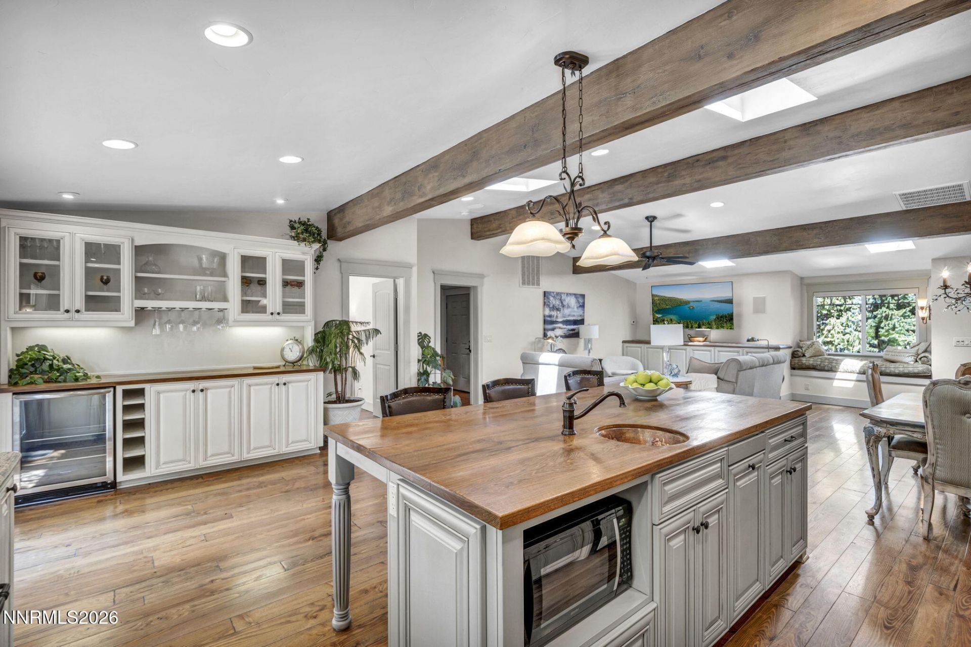 Tucked away on a quiet cul-de-sac in the desirable Tengana View community, this magnificent property offers the rare advantage of no HOA paired with exceptional design and comfort throughout. Surrounded by mature landscaping, the outdoor spaces feel like a private retreat-complete with a serene waterfall, inviting fire pit, shaded hammock, and multiple tranquil sitting areas. Entertain effortlessly with a covered barbecue deck and a patio just off the kitchen, creating seamless indoor-outdoor living. Inside, style and grace shine in every detail. Rich hardwood floors, soaring vaulted ceilings, and striking wooden beams define the great room, while elegant arched entryways add architectural charm. The thoughtfully designed kitchen features a copper farmhouse sink, center island with copper prep sink and breakfast bar, and direct access to the outdoor entertaining spaces. A built-in credenza with wine fridge, cozy window seat, skylights with electric shades, and recessed lighting elevate the home's warmth and functionality. The primary suite is a luxurious haven, showcasing vaulted ceilings, dual sliding doors to the patio, dual vanities, a freestanding soaking tub, curbless shower, heated floor, and a spacious California-style walk-in closet. Secondary bedrooms offer comfort and versatility, including one with patio access and another featuring a Murphy bed and charming fireplace. A guest bath highlights a handcrafted wood countertop and upright shower. Additional features include a well-appointed mudroom with washer and dryer included, built-in cabinetry, an RV garage with storage loft, EV charger, water softener system, and on-demand water heater. Zoned for an ADU, this property offers flexibility for future expansion or multi-generational living. This is more than a home-it's a peaceful, beautifully crafted sanctuary designed for both everyday living and unforgettable gatherings.